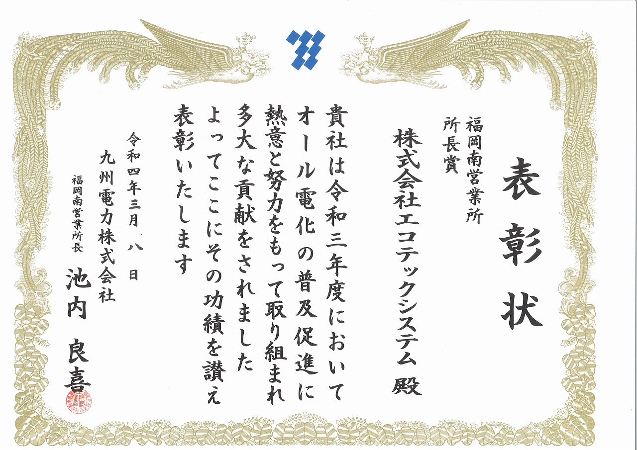 このたび、九州電力福岡南営業所様より、「所長賞」をいただきました。