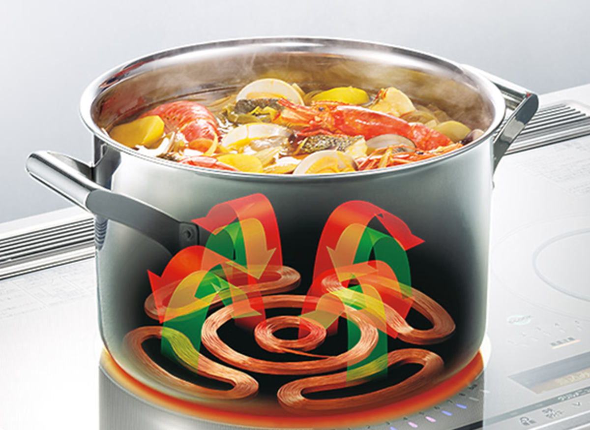 IHの誘導加熱技術は、鍋だけを効率よく加熱するしくみ。火を使わずに高火力調理が可能だから、安全性と機能性を兼ね備えた、次世代の調理スタイルです。